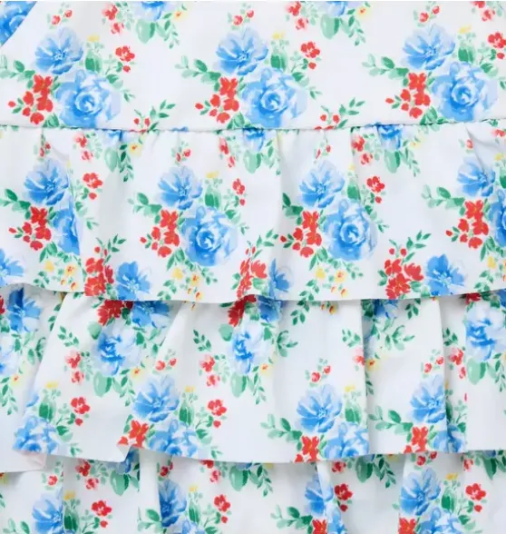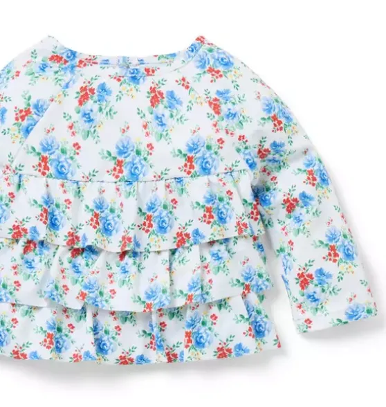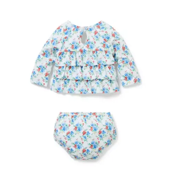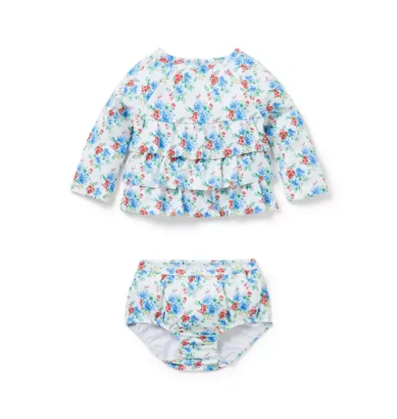 - Tiered ruffles and florals make the perfect match for our rash guard swimsuit. With UPF 50+ sun protection to help keep baby stylishly safe. Responsibly made with recycled polyester fabric.