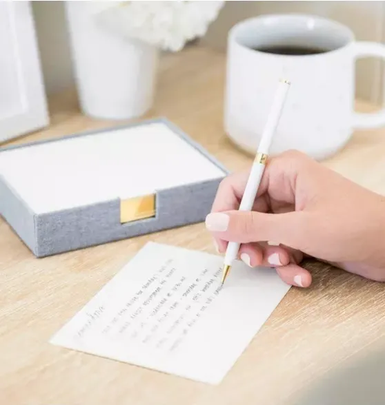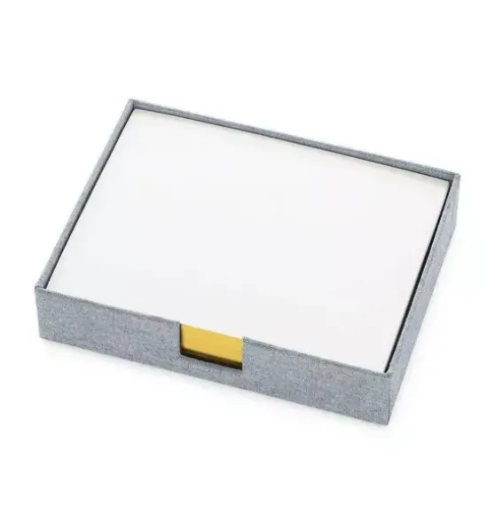 - The Sugar Paper Desk Jotter allows you to write notes on the go. Gold foil edged blank note cards are kept tidy in a chambray fabric holder to jot down a note whenever you need to.