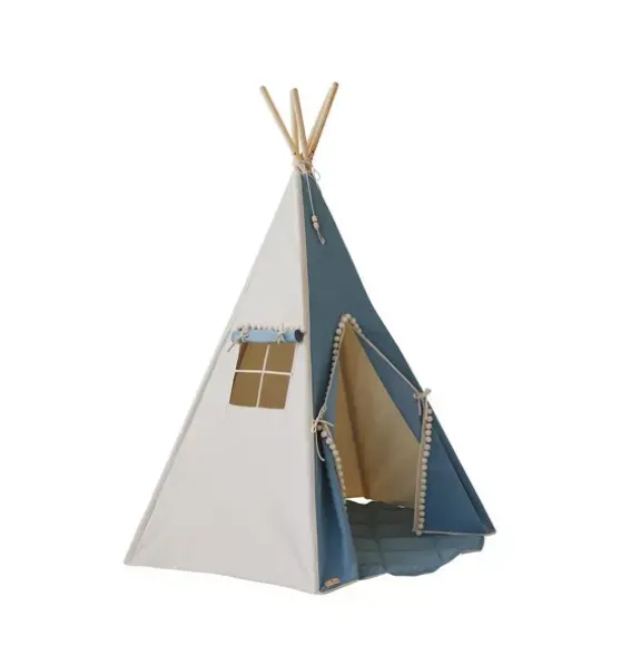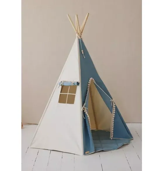- Your little adventurer may spend long hours exploring the world and playing, but upon return he or she needs a place to rest, eat, and make plans for further adventures. A teepee literally means a dwelling, and is a word used by the Sioux, the indigenous people of the Great Plains. It is a space for all kinds of fun. And it has a window with a curtain to watch the surrounding area! When the play is finished, you can pack the teepee back in the cover and put it away, for example, in the corner of the room. It does not take much space when folded, and the cover enables you to easily take it outdoors. There is a pocket inside where children can hide their toys, books and other treasures. The “Jeans” teepee with pompoms is a classic tent, often chosen for boys. Made of strong cotton and denim fabric, it is decorated with large pompoms. Made of natural materials: 1% cotton fabric and pine poles. Thanks to its five-wall structure, the tent is stable when it is put up, the poles are rounded and placed in tunnels sewn together at the bottom. The teepee is perfect to use at home, in the garden or at the beach. The set includes a play tent, poles and a cotton cover. Feel free to complement it with our beautiful decorations and accessories. Fabric: 1% OEKO-TEX® certified cotton. Fabric weight: 7.67 Washing temperature: up to 86°F. Pine poles: 7.9 in. Height when put up: 66.9 in. Base diameter: 47/52 in.Perfect for epic outdoor adventures or rainy-day indoor playdates, our adorable teepee tents give kids a peaceful place to hide out and let their imaginations run wild.The “Jeans” Teepee Tent is firmly sewn of strong cotton and denim fabric and adorned with large white pompoms around its openings. This teepee is made of natural materials; 1% cotton fabric and pine poles.Thanks to its five-wall structure, the tent is extremely stable.The set includes the teepee, poles, cotton cover and “Jeans” Round mat.<span mce-data-marked="1" Ourdurable and double-sidedsoft cotton quilted matisfilled with a thick insulation lining.Your little adventurer may spend long hours exploring the world and playing, but upon return he or she needs a place to rest, eat, and make plans for further adventures. A teepee literally means a dwelling, and is a word used by the Sioux, the indigenous people of the Great Plains. It is a space for all kinds of fun. And it has a window with a curtain to watch the surrounding area! When the play is finished, you can pack the teepee back in the cover and put it away, for example, in the corner of the room. It does not take much space when folded, and the cover enables you to easily take it outdoors. There is a pocket inside where children can hide their toys, books and other treasures. The “Jeans” teepee with pompoms is a classic tent, often chosen for boys. Made of strong cotton and denim fabric, it is decorated with large pompoms. Made of natural materials: 1% cotton fabric and pine poles. Thanks to its five-wall structure, the tent is stable when it is put up, the poles are rounded and placed in tunnels sewn together at the bottom. The teepee is perfect to use at home, in the garden or at the beach. The set includes a play tent, poles and a cotton cover. Feel free to complement it with our beautiful decorations and accessories. Fabric: 1% OEKO-TEX® certified cotton. Fabric weight: 7.67 Washing temperature: up to 86°F. Pine poles: 7.9 in. Height when put up: 66.9 in. Base diameter: 47/52 in.Fabric: 1% OEKO-TEX® certified cotton. Fabric weight: 7.67Washing temperature: up to 86°F.Pine poles: 7.9 in.Height when put up: 66.9 in.Base diameter: 47/52 in.Mat Size: 47×47 in. Thickness: 1 in.