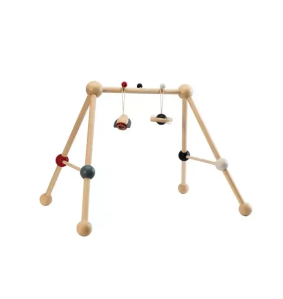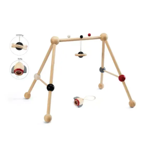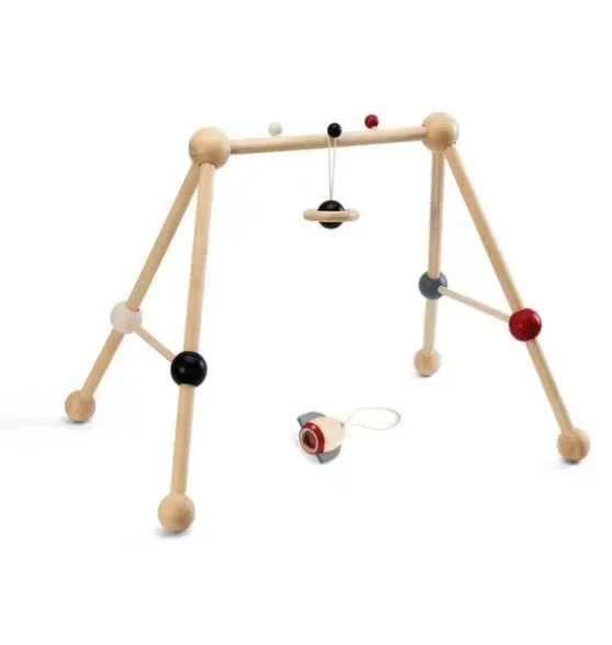 - This engaging play gym encourages babies to explore and interact with their surroundings, supporting early development and motor skills. It includes two high-contrast, suspended toys that captivate their attention and stimulate curiosity, promoting hand-eye coordination as they reach and grasp. As the child grows, these toys can be detached for continued play, adapting to different stages of development. The gym’s sturdy four-legged structure provides stability, preventing rocking and ensuring a safe environment for active play. Made from child-safe, eco-friendly materials, it’s designed with both safety and sustainability in mind. High-contrast colors are especially beneficial for young babies, as they are easier to see and help develop visual focus.