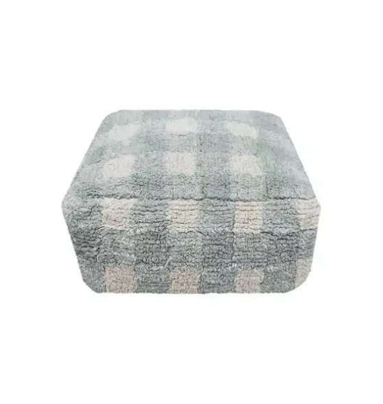 - A practical, square-shaped pouf, inspired by the pattern of woven vichy kitchen linen, featuring a bicolor checks’ pattern in Blue Sage and Natural. The pouf cover is made in recycled cotton canvas covered by a soft cotton pile, and has a zipper at the bottom to remove the inside filler before washing. Inside filler of polystyrene pearls.