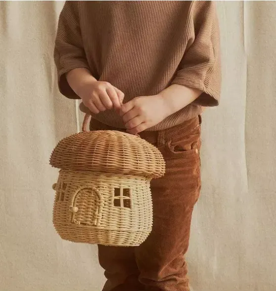 - PRODUCT INFORMATION• Handwoven with Natural Rattan• Secure Mushroom lid with a wood button & straw loop clasp• Mushroom top opens on a hinge• Door opens and shuts with a wood button & elastic loop• Adjustable handle• Flat base (stand up to display)• Designed for ages 3+ and with adult supervision from 18 months.