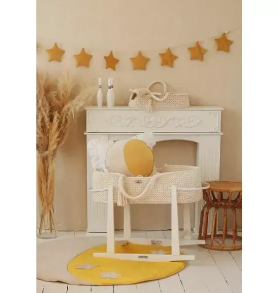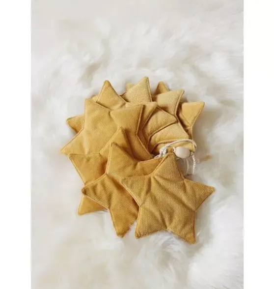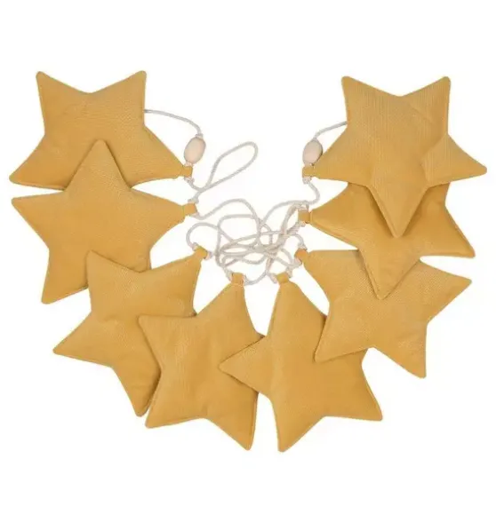 - The ultimate wall ornament, this garland will add a touch of stellar flair to any room in your home. Hang it above a crib, over a doorway, or even in your living room to quickly transform that empty wall into a stylishly accented interior.These garlands are also great compliments to our teepees, canopies, or cushions.data-sheets- Garlands are an ornament to any interior. You can use them to be part of the set design for a puppet show, a birthday party or a carnival ball. They can turn a child’s room into a magic kingdom, rock a play date, create a fairy-tale atmosphere for reading a book at bedtime. Garlands are a wonderful addition to a canopy, a tepee, a crib, wall decoration, or a window. Combine our garlands with canopies and cushions! The garland is carefully made of 6 yellow velvet stars, hung on a cotton string decorated with wooden beads. Six pendants in the shape of velvet stars on a cotton string, decorated with wooden beads. Dimensions of each pendant: 6 x 6 in. Garland length: 9’1" Carefully made of six yellow velvet stars, hung on a cotton string decorated with wooden beads.Dimensions of each pendant: 6 x 6 in.Garland length: 9’1″