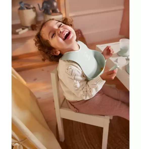 - Our baby bib has a soft and comfy neckband that’s easy to adjust as your child grows. It’s made of a water-repellent material that prevents mess and liquid from soaking through to stain clothes. The deep spill pocket also holds its shape, so any food it contains will not be squeezed out by your child’s movements. With a smart pack of 2, you always have a baby bib close at hand. Use one bib at home and pack the other in your nappy bag. Or use one bib while the other is in the dishwasher. Two baby bibs make it easier for you to avoid messy mealtimes.