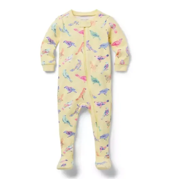 - Soar into good dreams in our feel-good soft, pure cotton PJ designed with a one-of-a-kind bird print. With even more good things, from its footed style to its easy zip front.