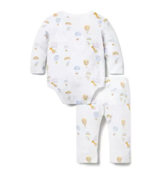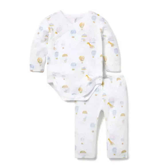 - Welcome baby in our soft cotton set with a playful hot air balloon animal print. Featuring a kimono-inspired wrap bodysuit and a pull-on pant with a little back pocket, just because.