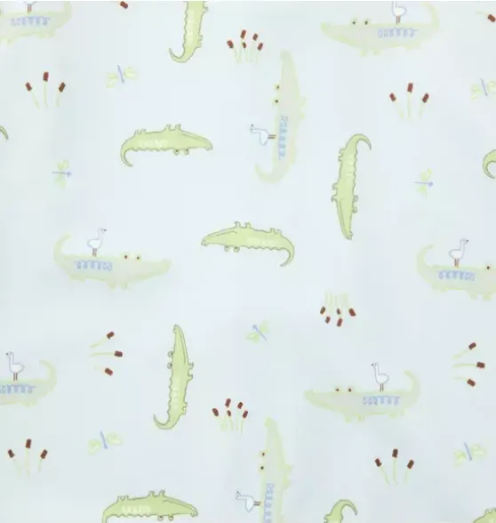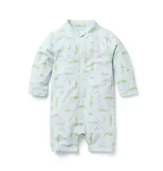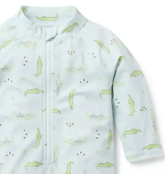 - Get into the swim of things with our rash guard swimsuit. We love its alligator print, raglan sleeves and zip front too. Designed with UPF 50+ sun protection and responsibly made with recycled polyester fabric.