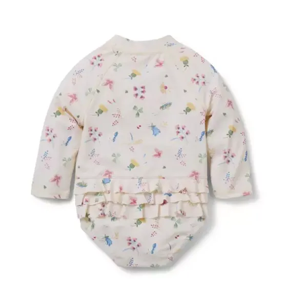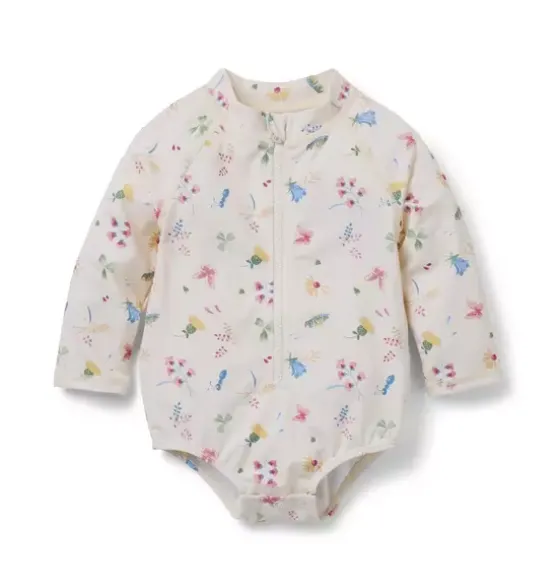 - Garden bugs and florals make the perfect duo for our rash guard swimsuit. With an easy zip front, plus UPF 50+ sun protection to help keep them stylishly safe. Responsibly made with recycled polyester fabric.