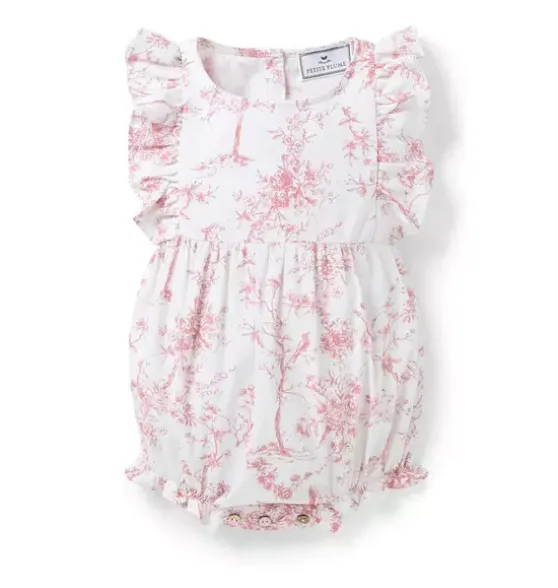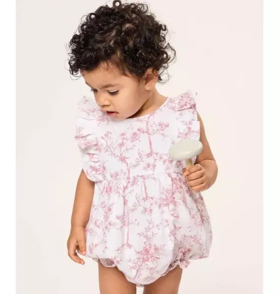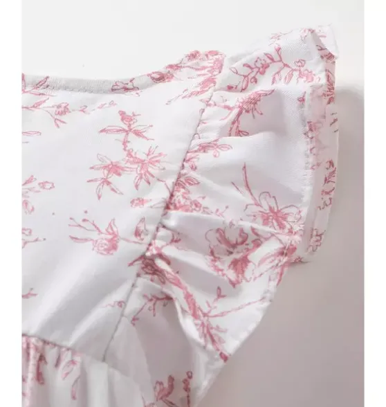 - Timeless beauty meets botanical elegance. Featuring hand-drawn illustrations of delicate botanical flowers in a striking shades of pink and white, this classic print is where refined luxury and botanical serenity collide.This darling romper with sweet ruffle hems and sleeves, and delicate pearl buttons, is reminiscent of the Victorian era. The sleepwear is made from the finest quality yarn-dyed cotton and blended with just enough inherently flame retardant fiber to allow it to pass strict CPSC flame retardant laws without using harmful chemicals. The fabric is brushed for added softness, making the sleepwear feel absolutely luxurious, getting cozier after each wash.In our luxurious sleepwear, your little one will be tucked in love and off to dreamland. Bonne nuit.