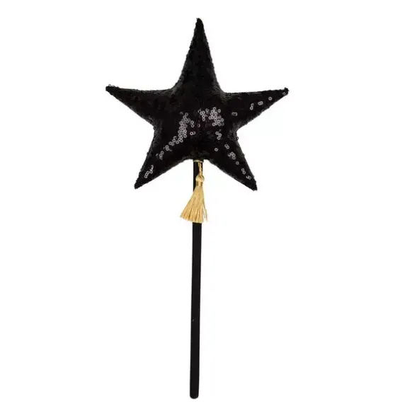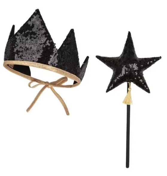 - Any imaginative young queen or king will invent endless adventures to embark upon when presented with this majestic crown and magical wand! Truly a must-have for theatre class, costume parties, fun photoshoots, fantasy playdates, or of course – Halloween. PART OF OUR MAGIC STORIES COLLECTIONThe crown ismade of high-quality cotton and covered with sparkling sequins. Tied in the back, it easily fits any size head. It is also double-sided. The wand has been carefully crafted from high-quality cottonand covered with sparkling gold sequins. The star is sewn toa pine stick and decorated with a dainty subtle tassel.Fabric: 1% OEKO-TEX® certified cotton with sequins.Washing Temperature: Up to 86°F.Crown Length (excluding ribbon): 16 in.Wand length: 14 in