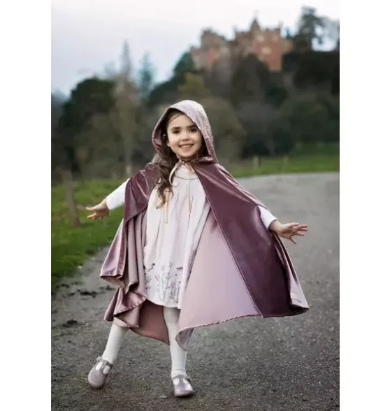 - Any imaginative child will invent endless adventures to embark upon when presented with this majestic magic cape! Our exquisite capes are truly a must-have for theatre class, costume parties, fun photoshoots, fantasy playdates, or of course – Halloween.PART OF OUR MAGIC STORIES COLLECTIONMade of shiny, soft plum velour with sparkling sequins.There is no way of knowing who your little one becomes today and which fantastic adventures he or she will take part in. That is exactly why you should prepare in advance for the roles of king, and queen, and dragon, and witch, and knight – to name just a few! Costumes are a must-have for theatre games, shows, costume balls, birthday parties and numerous photo shoots. A cape is a must-have if you want to play a queen, a sorceress, a fairy, a warlock, or want to go for a masked ball or trick-or-treating on Halloween. Simply put, it is essential for so many roles! You just don’t want to take it off! PART OF THE MAGIC STORIES COLLECTION Magic does not come just like that! It is obvious for all fairies and wizards. Casting magic spells requires suitable equipment such as magic capes, crowns, hoods and wands. Since every land has its own magic rules, you need to be prepared for virtually anything. Take our magic cape and create a sorceress’ or wizard’s set! A cape with a deep hood, made of soft plum velour. Great as a costume for a ball, Halloween or carnival. As it often becomes a permanent part of the outfit, it was provided with arm holes to facilitate play and daily activities Velour fabric with sequins. Length measured from the hood: 24 in front, 25.5 in back. Hood height: 13 in. Suggested size between 43 and 53 in Length (measured from the hood): 24 in front, 25.5 in back.Hood Height: 13 in.Suggested size is between 43 and 53 in.