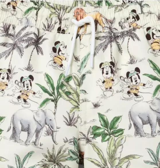 - We’re wild about this safari print swim trunk with Disney’s Mickey Mouse and Minnie Mouse. With UPF 50+ sun protection and a touch-close back pocket with embroidered eyelets to let water drain out. Responsibly made with recycled fabric.