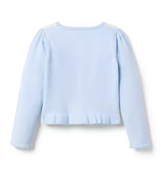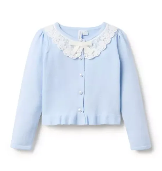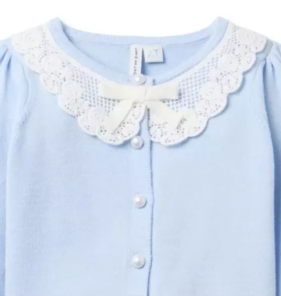 - All our favorite details for this soft cardigan, from the floral lace collar to the pearl buttons and the ruffle hem too. Plus, a bow detail and puff sleeves, just because.