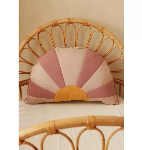 - No couch, chair, or bed is complete without a couple of decorative pillows to add a touch of style and a place to lay your head.This patchwork pink and yellow sun-shaped cushion is carefully made of high-quality cotton and linen.PART OF OUR FOLLOW THE SUN COLLECTIONFilled with high-quality anti-allergic silicone fiber balls, this pillow can be safely washed in a washing machine, and the filling will stay fluffy and elastic.Fabric: 1% linen, 1% cotton, both OEKO-TEX® certified.Dimensions: 25×16 in.Washing Temperature: Up to 86°F.