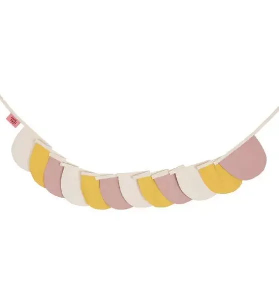 - The ultimate wall ornament, this garland will add a touch ofplayful flair to any room in your home. Hang it above a crib, over a doorway, or even in your living room to quickly transform that empty wall into a stylishly accented interior.These garlands are also great compliments to our teepees, canopies, or cushions.data-sheets- All the fun, circus stunts and laughing hard can make you feel dizzy! In every palace and every royal chamber, garlands highlight the magnificence of the little prince or princess and the little knight or fairy. The same goes for summer residences and temporary tents in the garden! PART OF THE CIRCUS TIME! COLLECTION The garland is part of our circus-themed vivid collection, specifically created to enliven any child’s room or bedroom. Combine our garlands with canopies and cushions! The garland is carefully made of beige, yellow and powder pink pennants in the shape of half-moons, sewn to a tape. Garland length: 8’2" Fabric: 1% linen and 1% cotton, both OEKO-TEX® certified. PART OF OUR CIRCUS TIME COLLECTIONCarefully made of beige, yellow, and powder pink pennants in the shape of half-moons, sewn to a cord.Garland length: 8’2″Fabric: 1% linen and 1% cotton, both OEKO-TEX® certified.