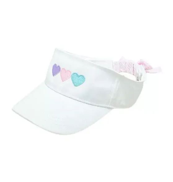 - Colorful, cute style starts with a bow visor that shades from the sun in a breathable, open design. A bow in back and a trio of hearts make a feminine finish to an athleisure accessory that takes her from play to party time, and everywhere in between.