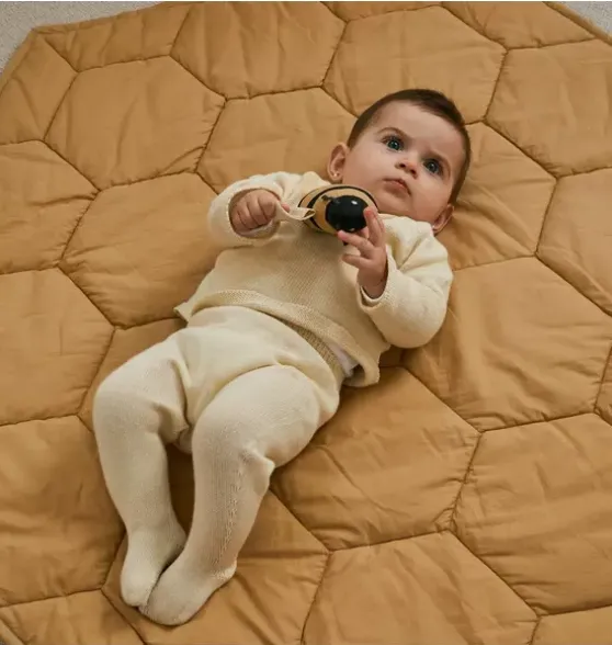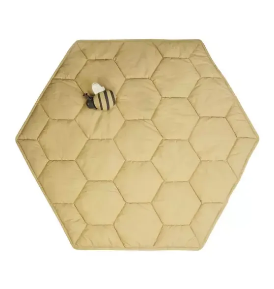 - The playmat Honeycomb is hexagonally shaped and quilted in the characteristic honeycomb pattern. Made of soft organic cotton poplin in Honey color, and filled with soft recycled polyfill, the play mat comes together with a charming bee rattle toy with crinkle paper inside.