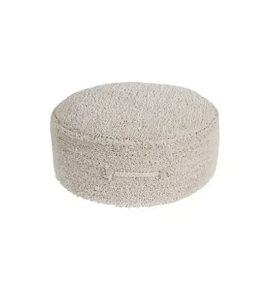 - Round pouf in Natural color with a handmade braid in matching color as a handle. Top and sides covered with soft rug pile, bottom part in cotton canvas, and finished with a zipper. Inside removable filler with polystyrene pearls.