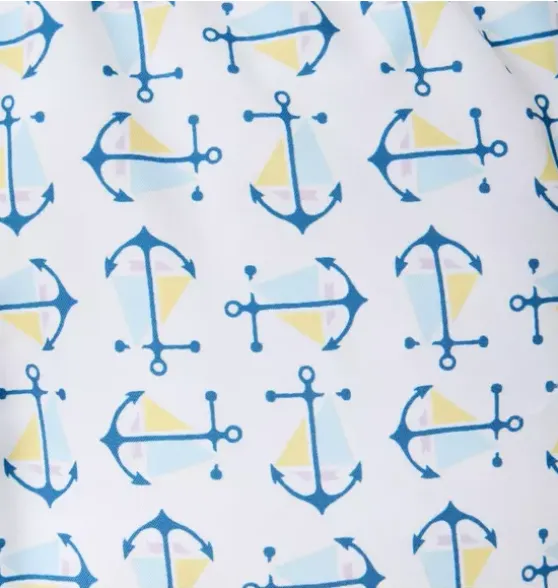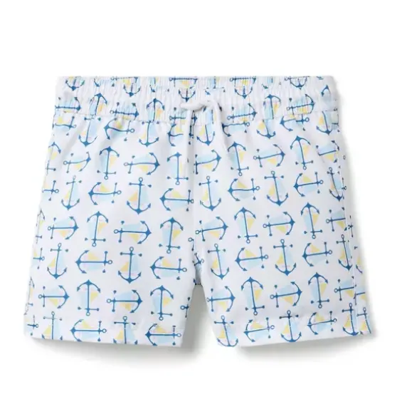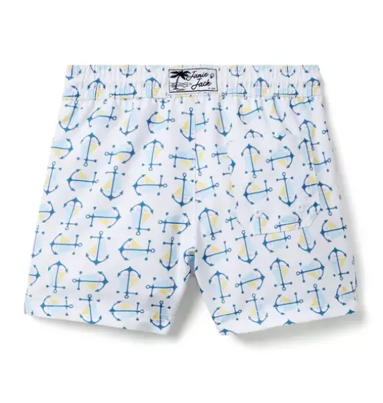 - Set sail for sunny days with our anchor print swim trunk. With UPF 50+ sun protection, a touch-close back pocket and embroidered eyelets to let water drain out. Responsibly made with recycled fabric.