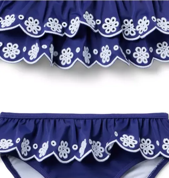 - With floral eyelet details and scalloped ruffles too, our swimsuit is always in style. Designed with cross back straps and UPF 50+ sun protection. Responsibly made with recycled polyester fabric.
