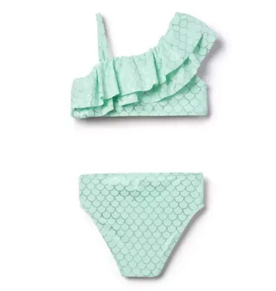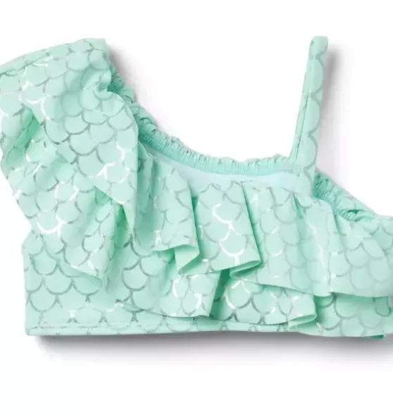 - Make a splash in our swimsuit featuring a mermaid-inspired scale print. With a one-shoulder ruffle design and UPF 50+ sun protection to keep them stylishly safe. Responsibly made with recycled polyester fabric.