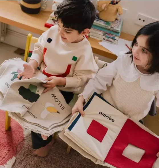 - Learn to recognize basic shapes and colors!Inspired by the geometric shapes that identifies the Bauhaus movement, the Bauhaus book features primary colors and shapes using cotton canvas fabric patches and cut-outs, mixing different textures to explore. Handcrafted from textile scraps combined with embroidered details, the book is a first introduction to basic colors.It is made by upcycling textile scraps from our own factory making it a sustainable choice for your kids decor.
