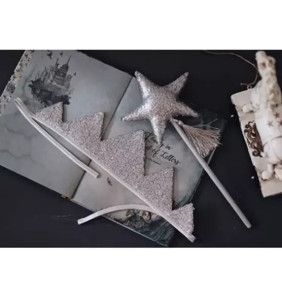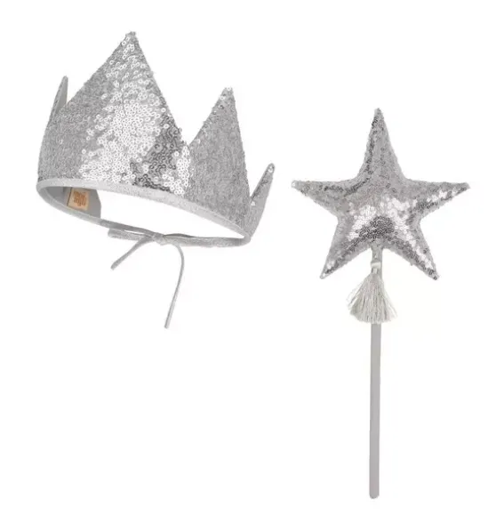 - Any imaginative young queen or king will invent endless adventures to embark upon when presented with this majestic crown and magical wand! Truly a must-have for theatre class, costume parties, fun photoshoots, fantasy playdates, or of course – Halloween. PART OF OUR MAGIC STORIES COLLECTIONThe crown ismade of high-quality cotton and covered with sparkling sequins. Tied in the back, it easily fits any size head. It is also double-sided. The wand has been carefully crafted from high-quality cottonand covered with sparkling gold sequins. The star is sewn toa pine stick and decorated with a dainty subtle tassel.Fabric: 1% OEKO-TEX® certified cotton with sequins.Washing Temperature: Up to 86°F.Crown Length (excluding ribbon): 16 in.Wand length: 14 in
