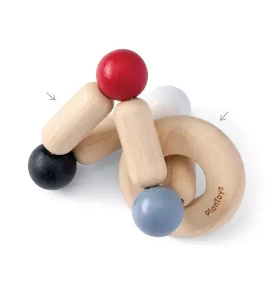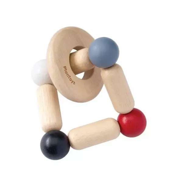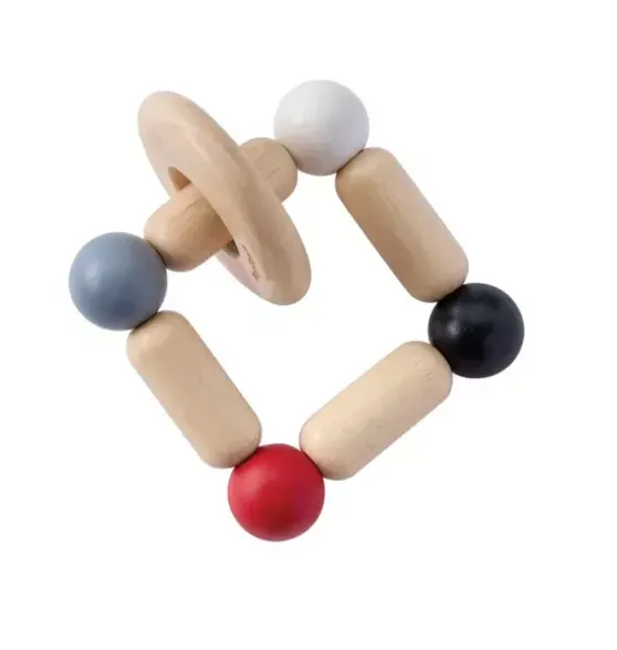 - This is a flexible, square-shaped wooden toy featuring colorful red, white, black, and gray beads that slide and rattle. As babies grip and squeeze its bendable frame, it helps develop fine motor skills and hand-eye coordination. The rattling sounds support auditory development, while the toy encourages tactile exploration, bilateral coordination, and cognitive growth through cause-and-effect learning, offering complete sensory stimulation. High-contrast colors are especially beneficial for young babies, as they are easier to see and help develop visual focus.