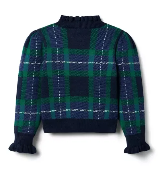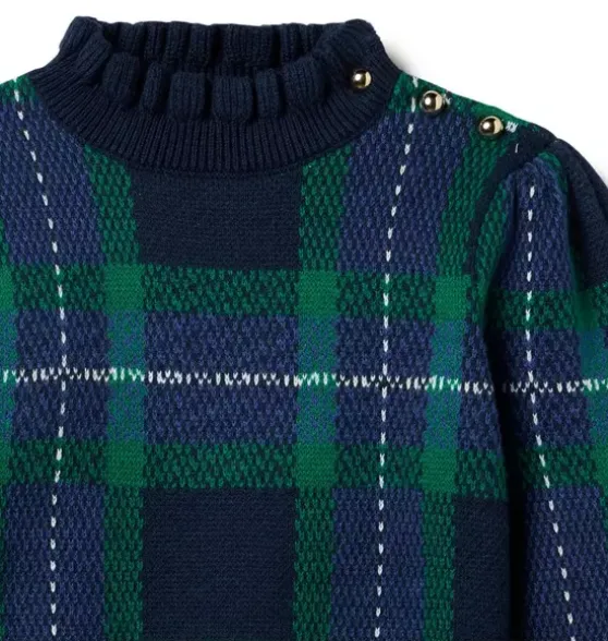 - Check every style box with this cozy tartan sweater. Featuring a ruffle collar and gold-tone buttons at the shoulder for extra polish.