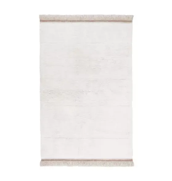 - Rectangular rug combining a soft short wool pile with horizontal rows of extra short pile, creating a subtle pattern. Finished at edges with a contrast color line and short fringes coming out from the base.